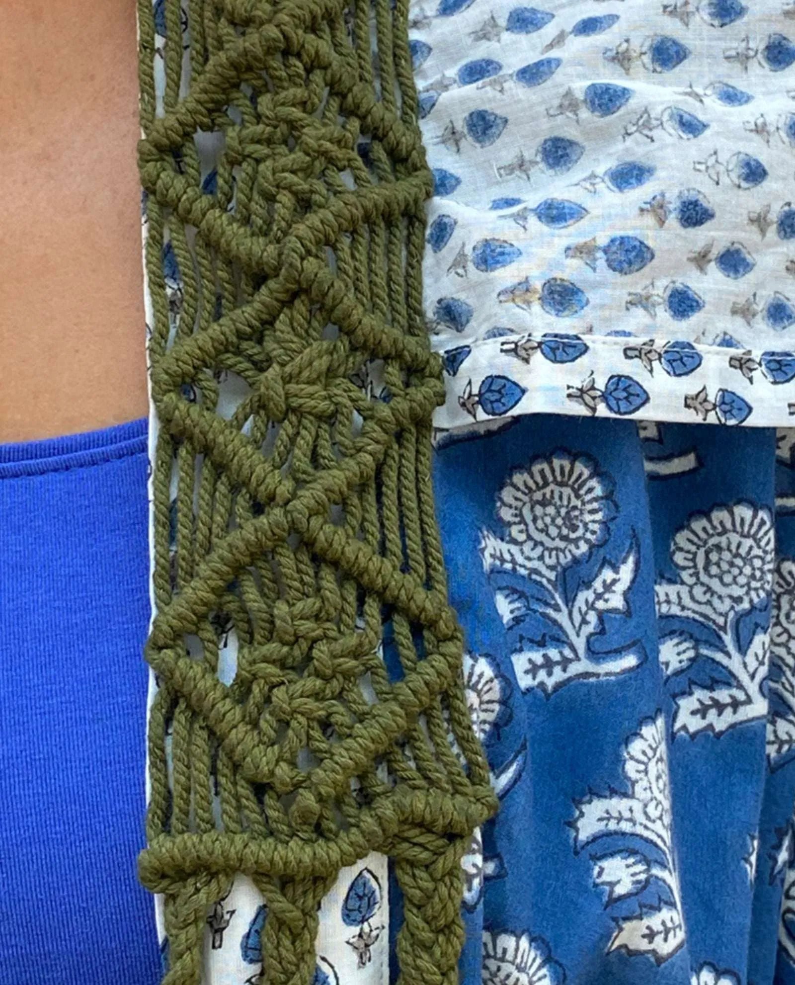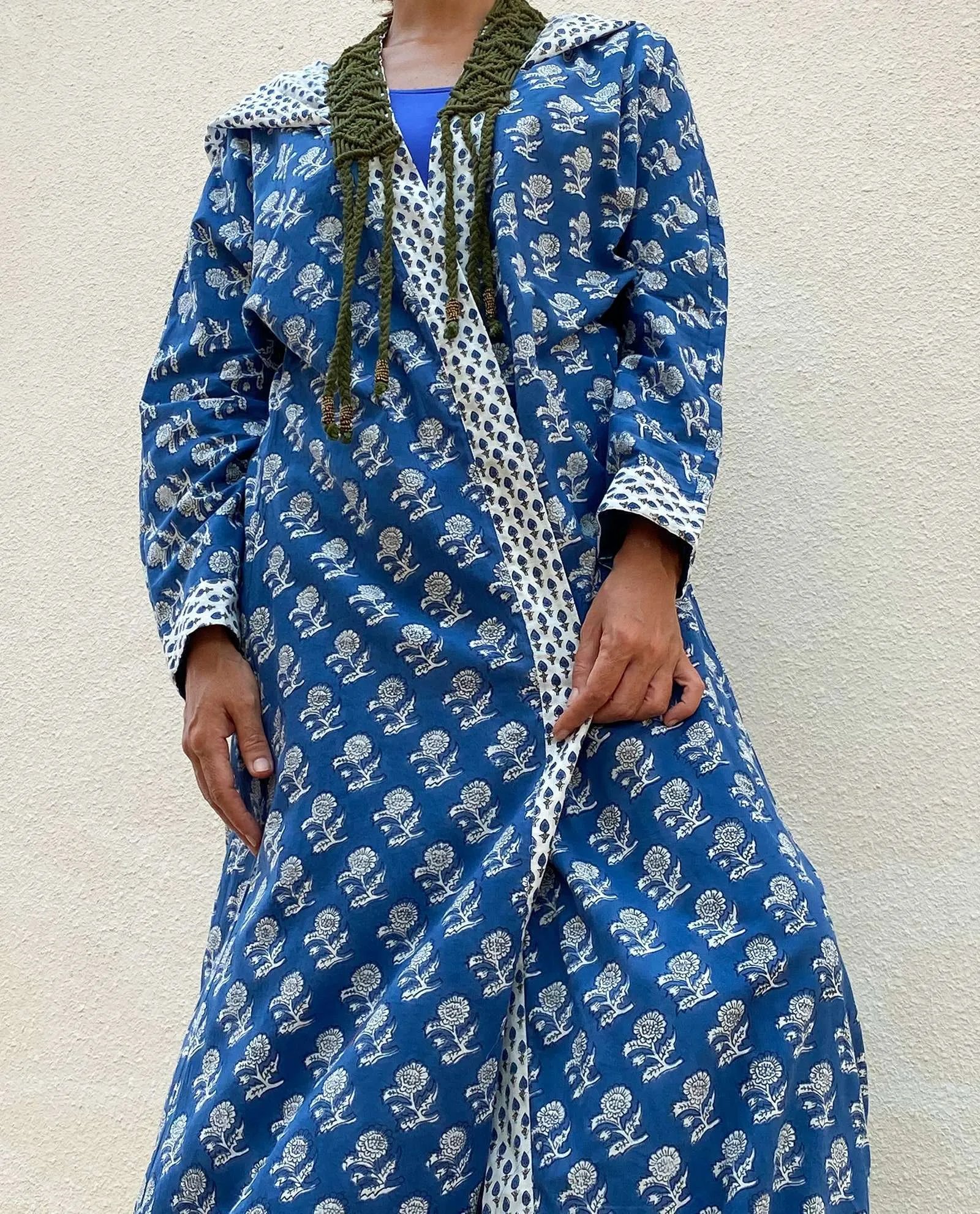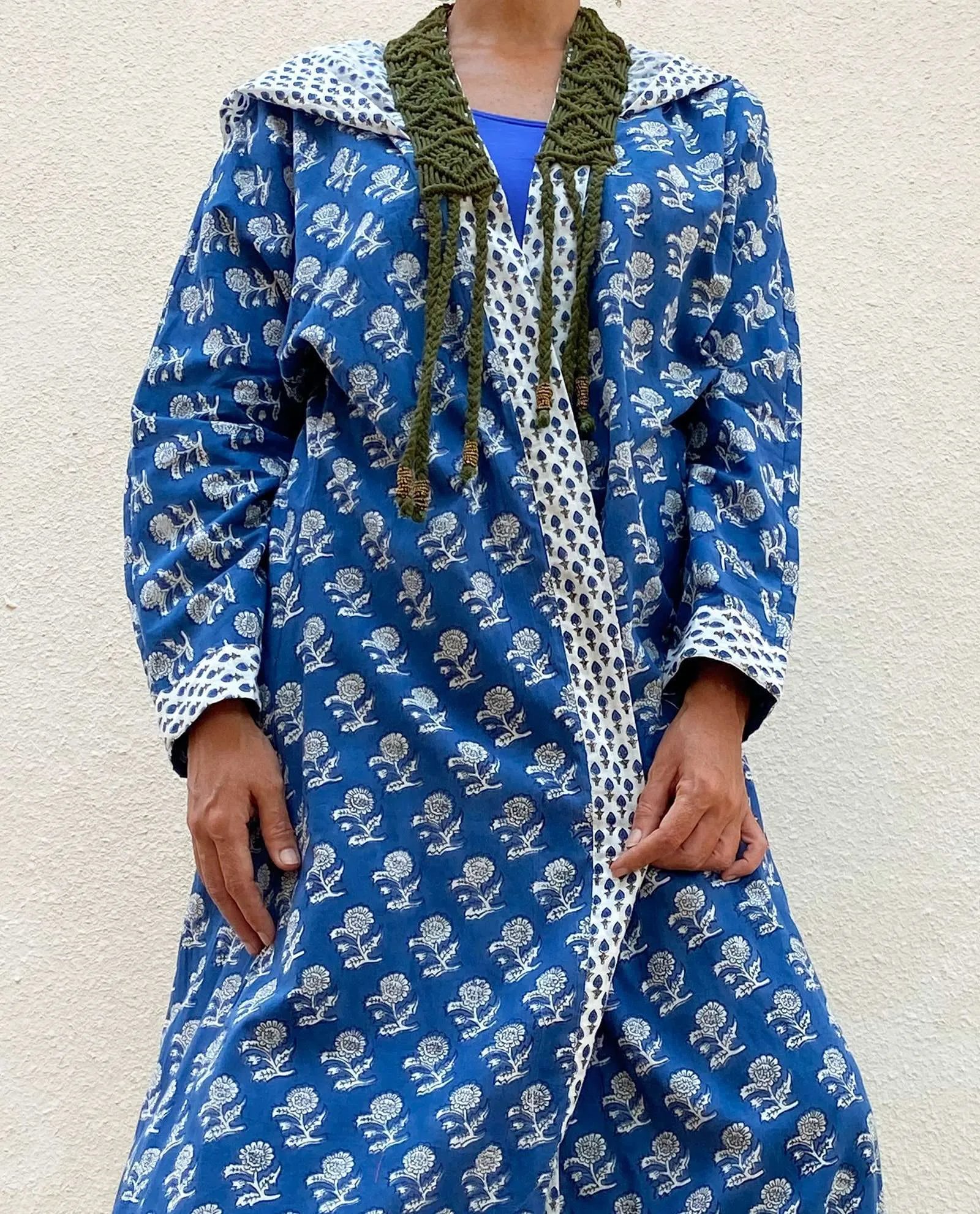 Casual Blue cotton enriched with white flowers & sleek white strips with dark green collar knitting.